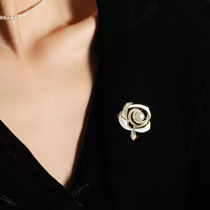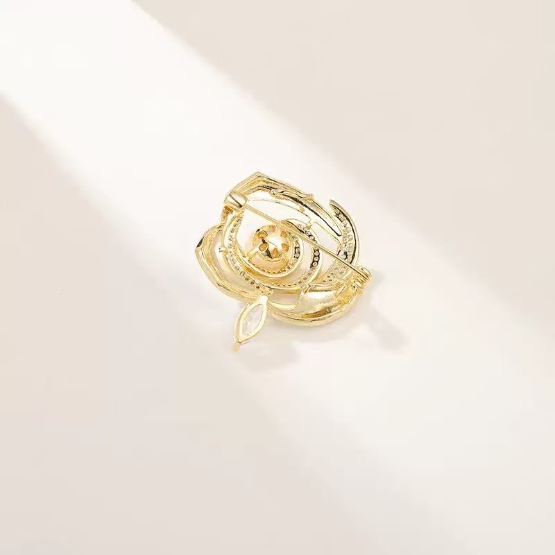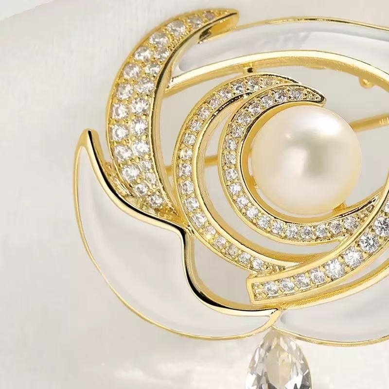 Luxury Jewelry 18K Gold Enamel Design Camellia Flower Freshwater Pearl Brooches for Gift